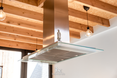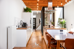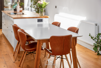 Wit hoogglans, hout en inox: de keuken is lang, logisch en verdomd goed doordacht. Aan één zijde de volledige keukenrij met spoelbak en elektrisch kooktoestel. Aan de andere kant een ruim kookeiland dat uitnodigt tot samen koken, samen eten, samen zijn. Naast het kookeiland staat de eettafel, met zicht op de tuin en het licht dat 's ochtends binnenkomt vanuit het oosten. Goeiemorgen.